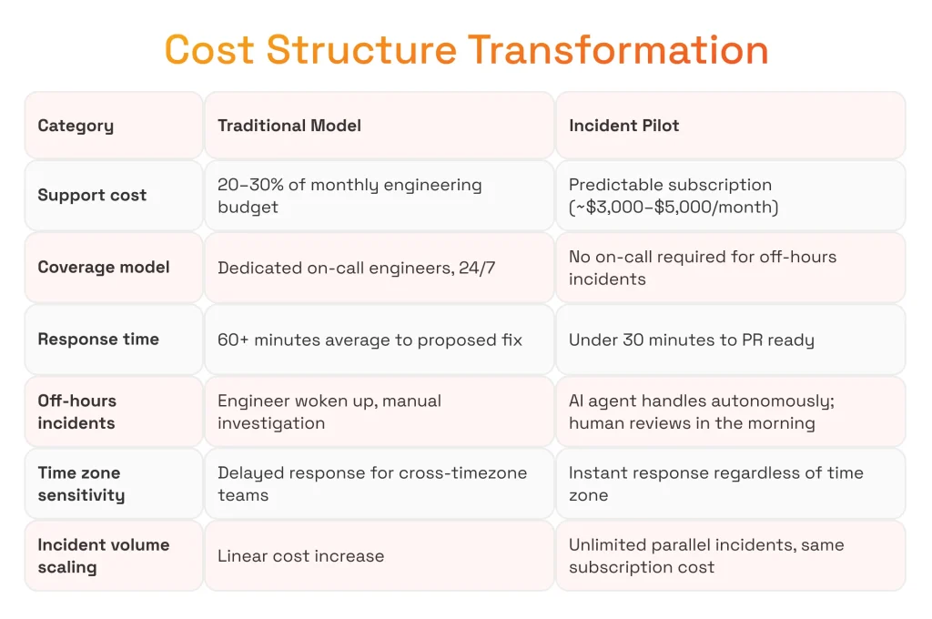 - On-call costs are disproportionate to incident frequency. In a traditional support model, 20–30% of the total monthly engineering budget is allocated to support contracts — most of which pays for human availability during quiet periods, not actual incident work.