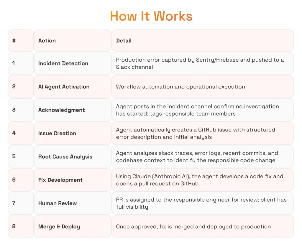 - Time zone gaps cause dangerous delays. For US-based clients with European engineering teams, incidents happening at night trigger a slow, manual chain reaction: alert fires → engineer wakes up → logs in → reads context → investigates → begins writing a fix. By the time a fix is proposed, significant time has passed and business impact has accumulated.